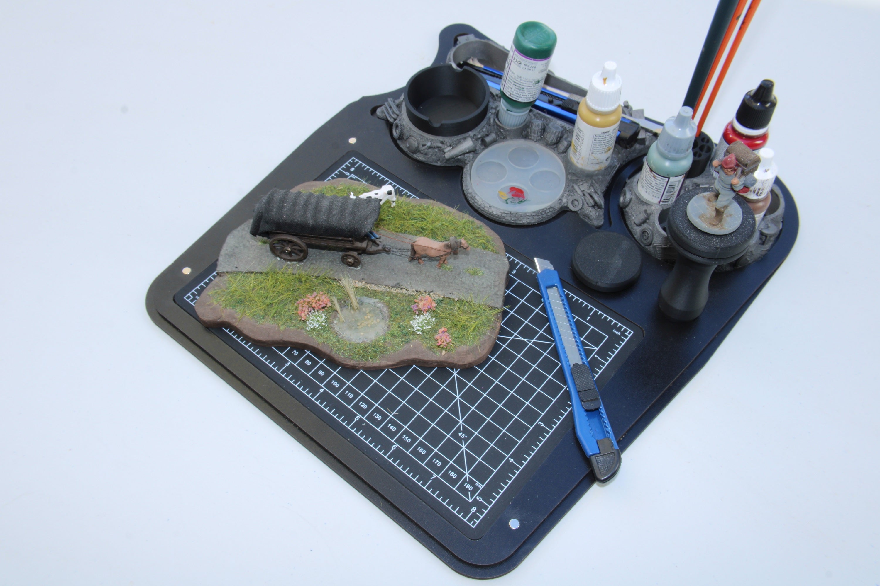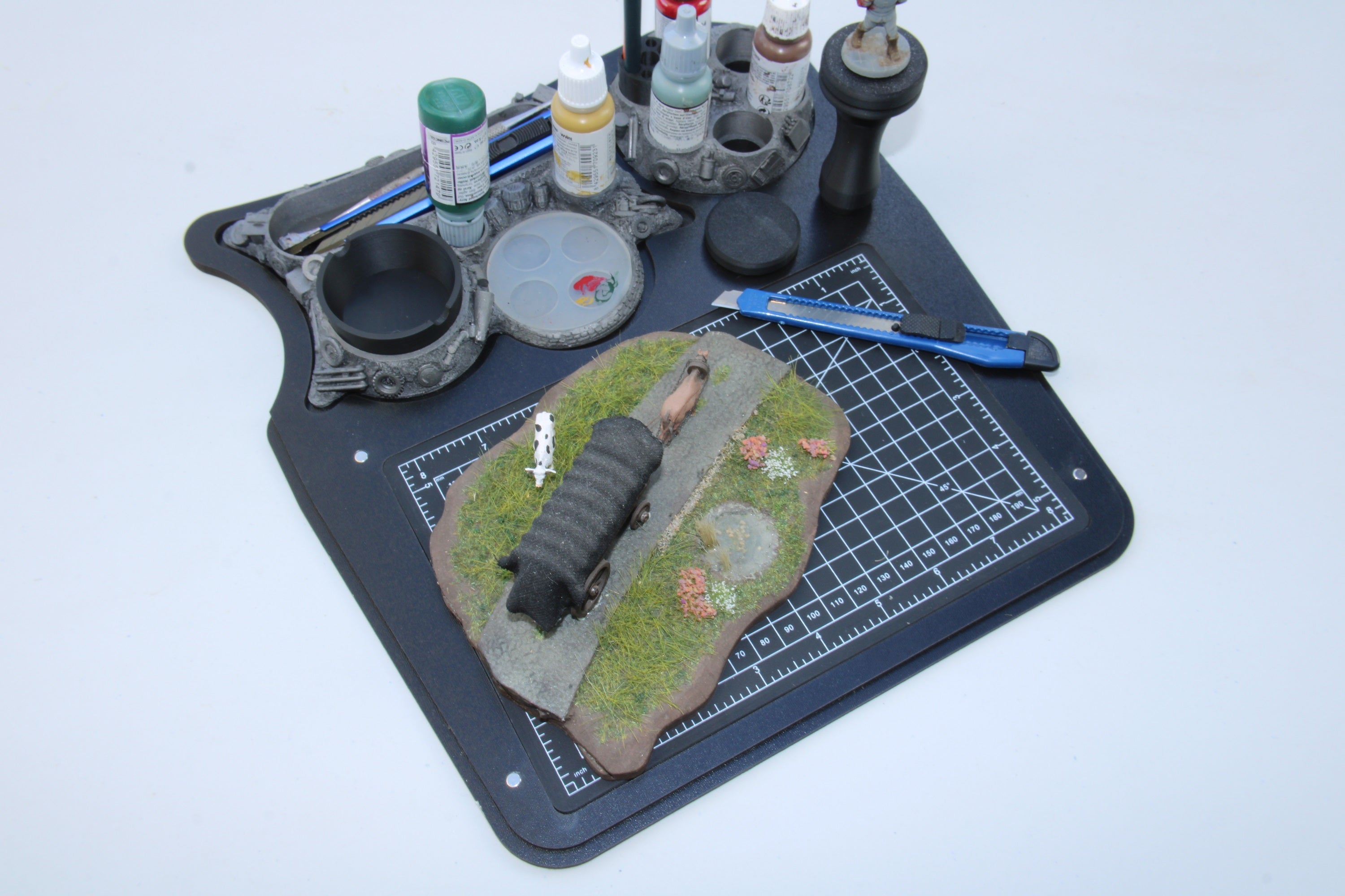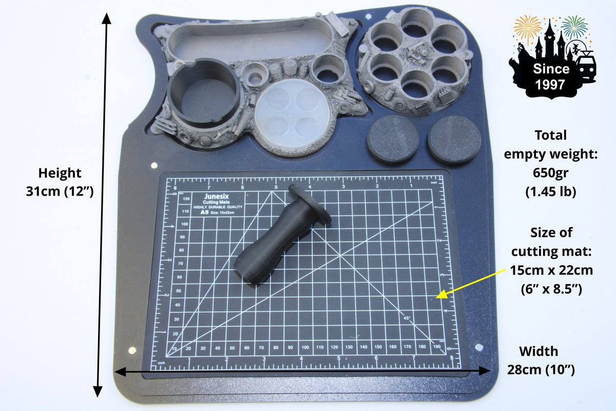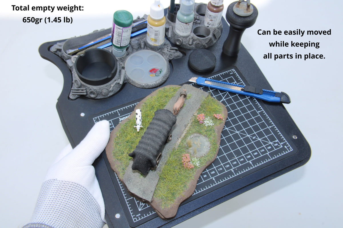 Solid and stable base with pre-mounted resin modules to hold your tools and paints. Built to withstand precision cutting, sculpting, or terrain work. -