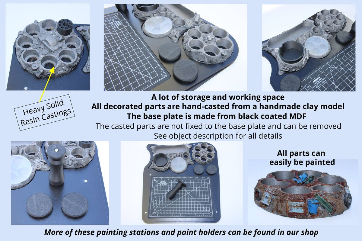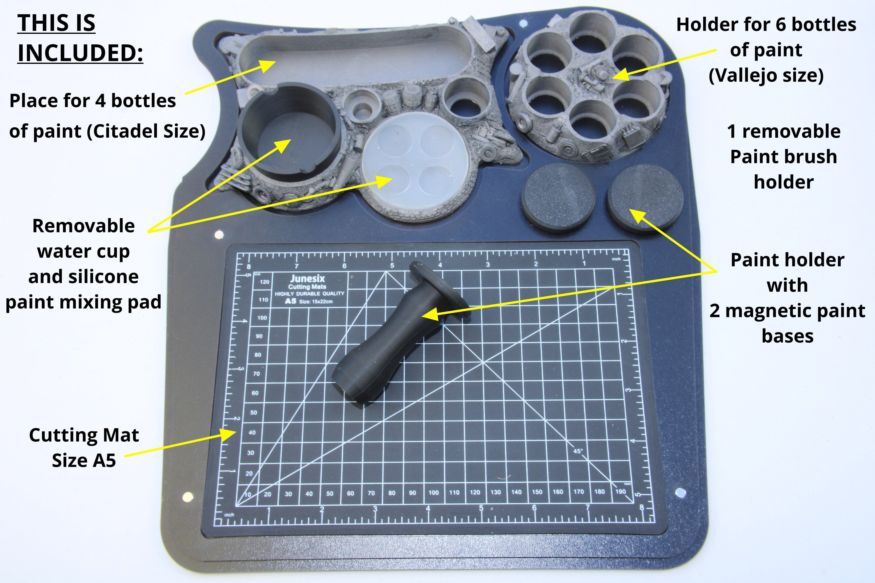 Includes handcrafted resin holders compatible with various paint bottle sizes (Vallejo, etc.), a circular mini palette slot, and upright brush/tool holders. -