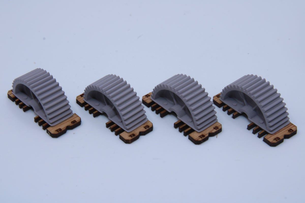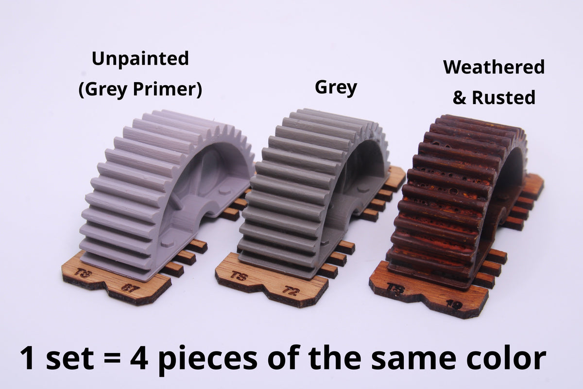 These detailed half-gear units mounted on wooden pallets are ideal as train loads, factory yard details, or industrial storage items.