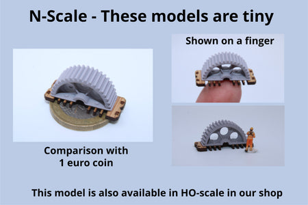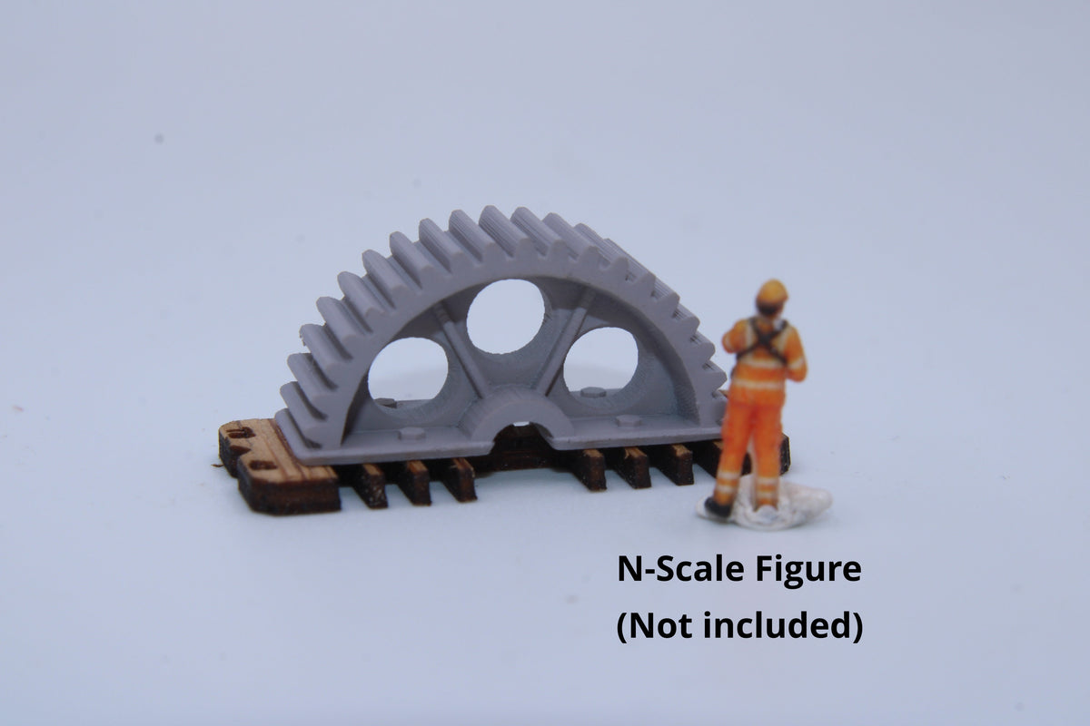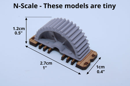 Add unique and realistic industrial detail to your N scale (1:160) model railroad with this industrial gear / machinery load set.